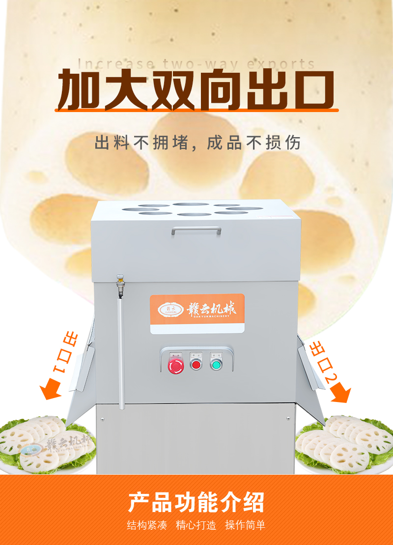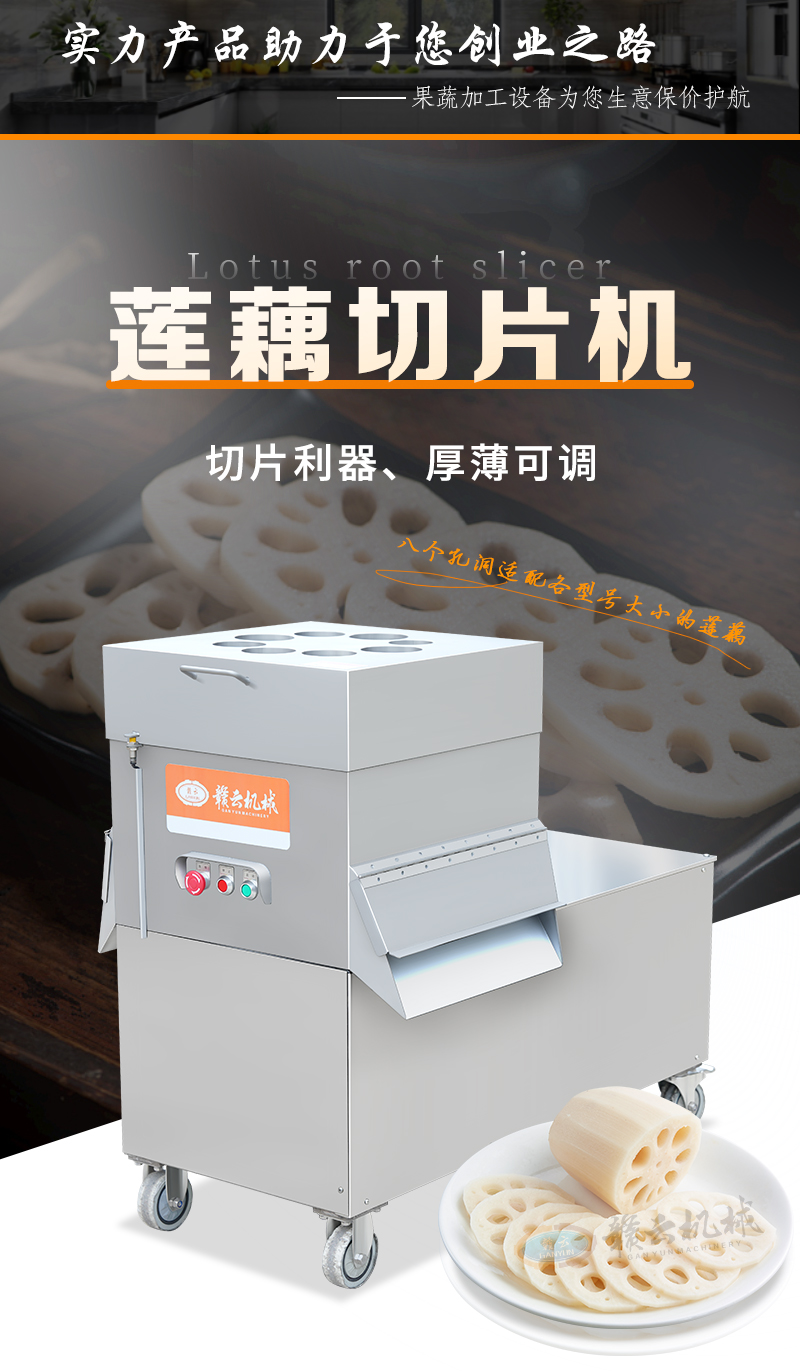 蓮藕切片機專為土豆、蓮藕、白蘿卜、檸檬、蘋果、胡蘿卜、西紅柿、獼猴桃等果蔬切片。采用下壓式設計,食品級不銹鋼材質,整體操作簡單,清洗方便,安全耐用。采用雙切刀進行切片,八孔入料設計,大大提升了切片效率。這款高效的蓮藕切片機,適用于商用廚房、中央廚房、營養(yǎng)餐供餐中心、食堂、食品廠等,幫助您快速完成各種水果或球根莖類蔬菜的快速切片加工。