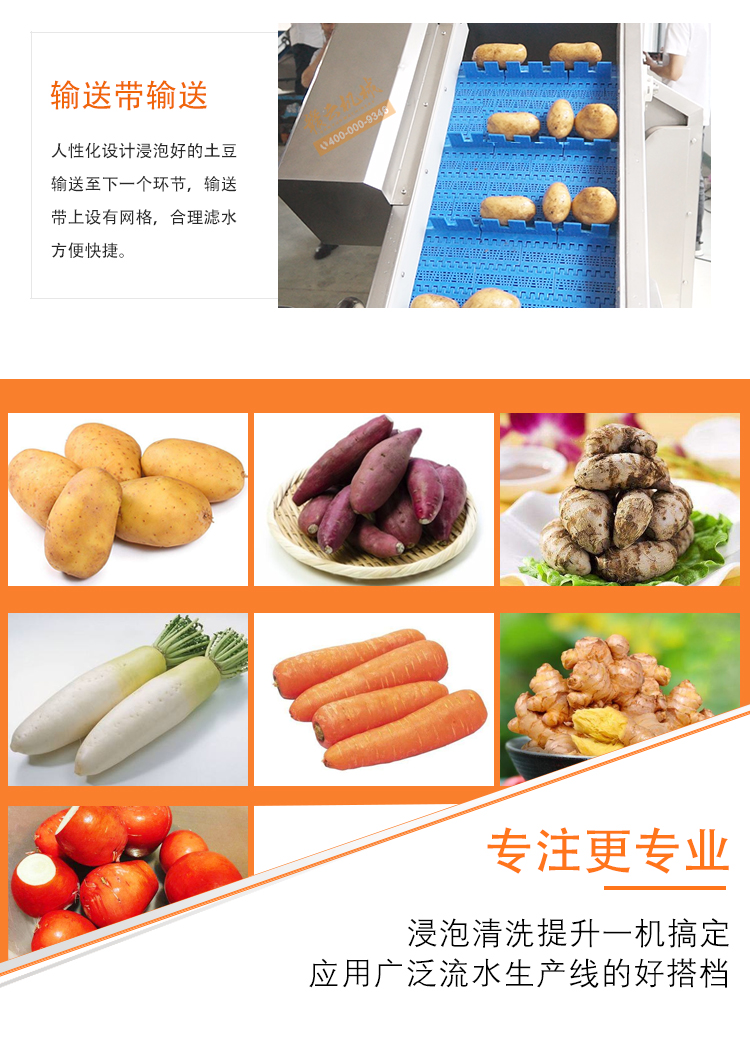 適用于根莖類蔬菜清洗,比如土豆,紅薯,蘿卜,生姜等的清洗